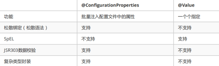 @Value这个使用起来并不友好!我们需要为每个属性单独注解赋值,比较麻烦;我们来看个功能对比图
